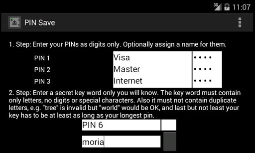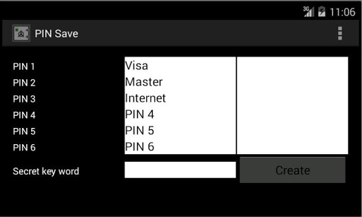 PIN Save ist eine einfache Anwendung zum Merken von bis zu 8 PINs. Die eingegebenen PINs werden in einer Matrix aus zufällig erzeugten Zahlen versteckt. Nur mit Hilfe Ihres geheimen Schlüssels können Sie Ihre PINs in der Zahlenmatrix lesen. Die PINs selbst und Ihr geheimes Schlüsselwort werden nicht gespeichert. PIN Save kann für die PINs von Kreditkarten, EC-Karten, Handys, Internetzugängen, etc verwendet werden.