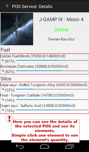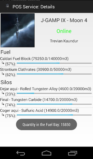 POS Service's main functionality is to manage and get information about POSes and moon reactions. Although you can use this app to see the fuel/stromtium/charters left in your POS.
