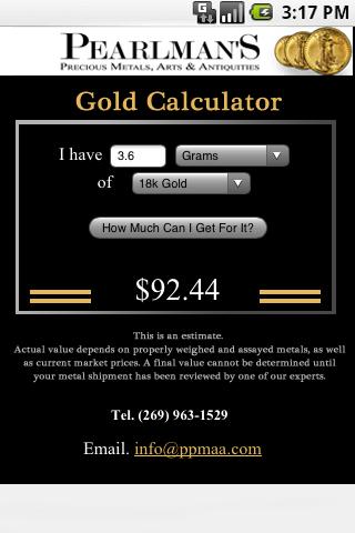 Pearlman's Precious Metals, Arts, and Antiquities (PPMAA) is a division of Pearlman's Jewelers for buying gold, platinum, jewelry, and more. We are pleased to provide you with the current up-to-date gold price chart, which refreshes every two minutes, and a calculator for how much we will pay you for your precious metals. The calculator is set to the current price of gold for various karat purities. Even in times of uncertainty, i.e. The Great Depression, the 1978-1982 recession, and the current recession, we have seen a major sell off of gold, silver, and other valuable items. Will they go higher or lower? Who knows? But if you feel now is the time to sell, then we are here to help.