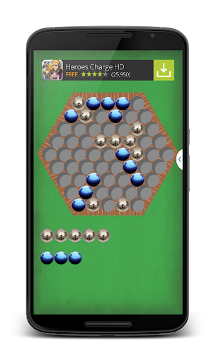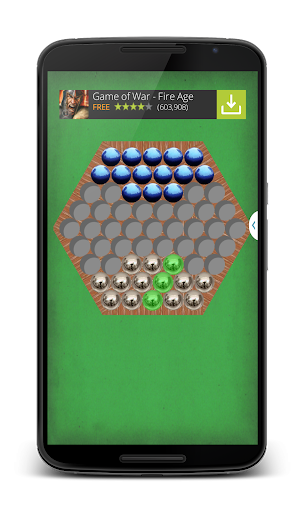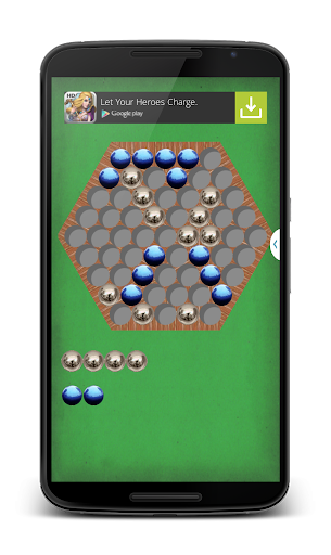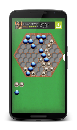 PUSH BACK The board consists of 61 circular spaces arranged in a hexagon, five on a side. Each player has 14 marbles that rest in the spaces and are initially arranged as shown at left.Play alternates between the players one move at a time, with the black marbles moving first. For each move, a player moves a line of one, two or three one space. The move can be either in-line (parallel to the line of marbles) or broadside (not parallel to the line of marbles).