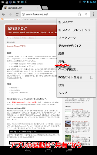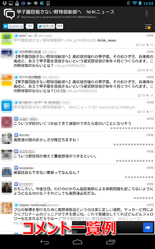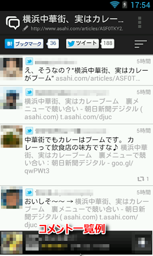 Webページ閲覧中にブラウザなどの共有ボタンから、本アプリ選択するだけです。そうすると、本アプリが記事に対するコメントを取得し、一覧表示します。