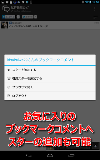 ・本アプリで直接はてなブックマークは行えません。その代わり、本アプリからはてなブックマーク公式ページをブラウザで起動または、公式Androidアプリを起動できます。