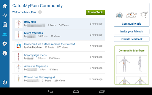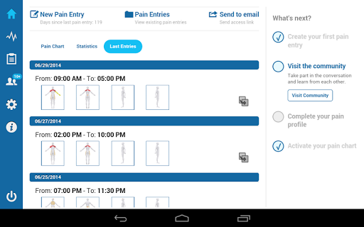 Medical experts recommend you keep a pain diary to be able to treat pain effectively. The award winning "Catch My Pain" app allows you to visualize and monitor your pain by creating detailed drawings and by tracking other relevant information. The diary will help you to explain your pain to any care provider.