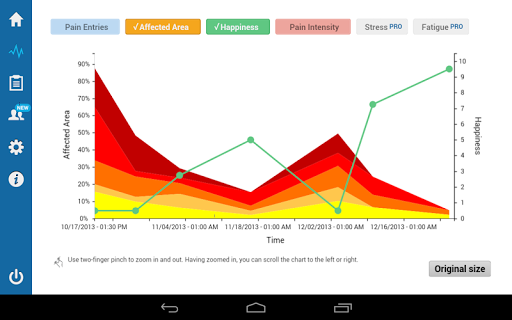 Keep a medical health record of fibromyalgia, migraine, cancer, arthritis, lupus, headache, rsi, chronic lower back pain, rheumatism, sciatica, cfs, fatigue syndrome, depression, crps or endometriosis symptoms for your doctor. Understand what happens with the pain in your knee, hip, shoulder, joint, chest, neck, stomach, leg, arm, or with your abdominal ache, tumor, etc. Know the impact and scale of your pt, therapy and diagnosis. Manage your pain.