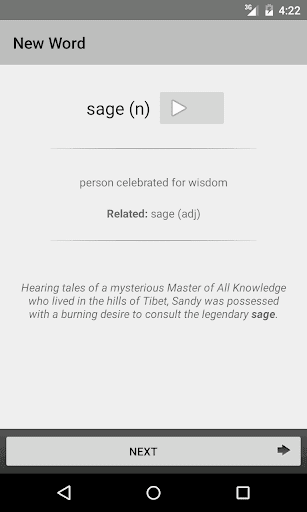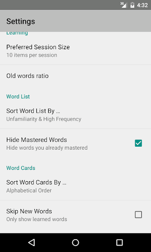 In summary, the app takes care of old words/new words for you. The principle is few repetition over a long, increasing periods of time is more effective than lots of frequent ones. I add some options other than the default ones due to excessive whining from multiple people. Use them at your own risks. Basically, if you're trying to cram a crazy number of words in a short period of time, you're looking for something else. Please don't ask for a "fix".