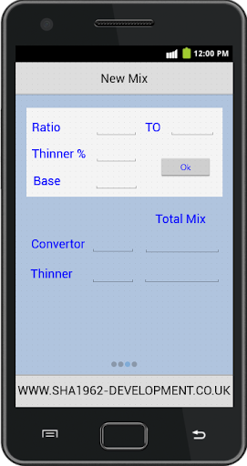 works on Ratio, Thinner % and Quantity of Base Colour. Enter these three values, press [ OK ] Button, this will calculate the amount of Convertor and Thinners required, and display the mixing details informing you of the amount of materials, that should be in your mixing vessel at each stage of the mix.