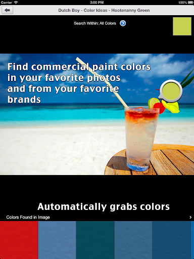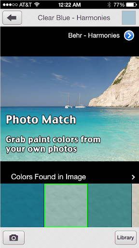 * Snap a picture and touch the image to get a matching brand color. Use paints on your walls, chips from the store, or even vacation photos to grab colors.