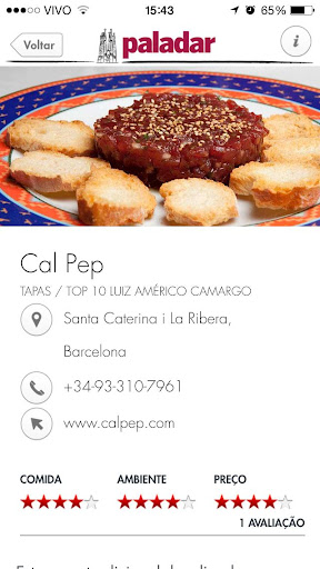 As melhores experiências na Espanha para o viajante apaixonado por gastronomia, selecionadas pelo PALADAR, do Estadão. Um app da coleção VIAGENS GASTRONÔMICAS, com dicas preciosas para ter sempre à mão, na tela do smartphone: os melhores lugares para comer, fazer compras gourmet e beber, incluindo paradas estratégicas perto das principais atrações turísticas – todo o conteúdo pode ser acessado mesmo sem wi-fi ou 3G. Com geolocalização, calculadora de gorjeta, avaliação dos estabelecimentos pelos usuários, perfis de chefs, glossário e muito mais!