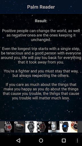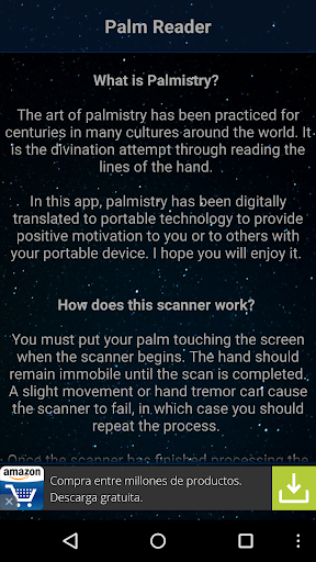 Prank your friends with this funny Palm Reader App! This app simulates a scanner that reads the palm with realistic visual and sound effects and showing the results on the screen. The results will always provide motivational phrases.