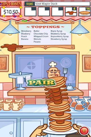 In Pancakes!!! you go to work building stacks of pancakes and toppings to order.