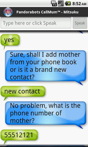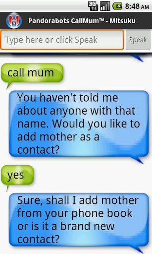 Unlike other virtual assistant apps for Android and iPhone, CallMum includes a learning feature so that it can learn your personal preferences and contacts, and be taught to correct speech recognition errors. CallMum can be connected to a variety of pandorabot personalities, including ALICE, Mitsuku, Professor, English Tutor, Zoe, Fake Captain Kirk and others.