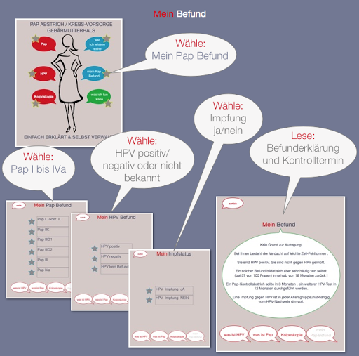 Die App ermöglicht durch Eingabe der eigenen Daten über den Pfad “mein Pap“ eine individuelle Beratung über den persönlichen Befund und dessen medizinische Aussage.