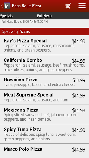 Enjoy the convenience of online ordering with the Papa Ray's Pizza mobile app. You can now use your Android to order food from our restaurant locations. It's the most convenient way to order our delicious food. Open the app, add some items to your cart, checkout and you're ready for pickup.