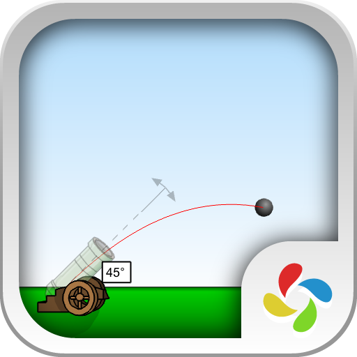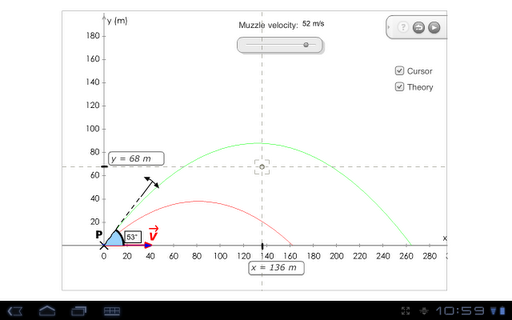 You can adjust the angle of the cannon relative to the horizontal. The muzzle velocity can also be adjusted. A cursor is provided to enable the making of measurements. The “Theory” button provides a mathematical representation of the experiment. Air resistance is ignored.
