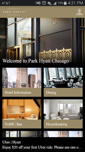 With the complimentary Park Hyatt Chicago Guest App, we invite you to experience Park Hyatt from your mobile device. Even before you arrive, learn about hotel services and the local area. While staying at the hotel, order room service, request housekeeping services, schedule transportation, and much more.