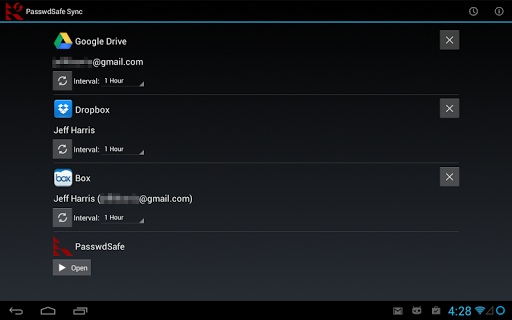 PasswdSafe Sync is a PasswdSafe companion app to access files stored in cloud services. Password files are synchronized with Google Drive, Dropbox, Box, and ownCloud.