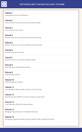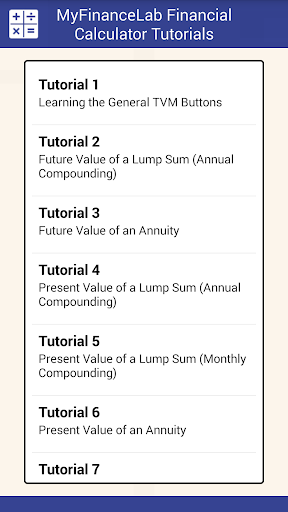 The Pearson Financial Calculator app gives you access to a fully functional financial calculator along with interactive tutorials. The financial calculator allows you to solve Time Value of Money, Cash Flow, and Amortization problems, while the interactive tutorials walk you through how to solve key financial problems using the Pearson Financial Calculator.