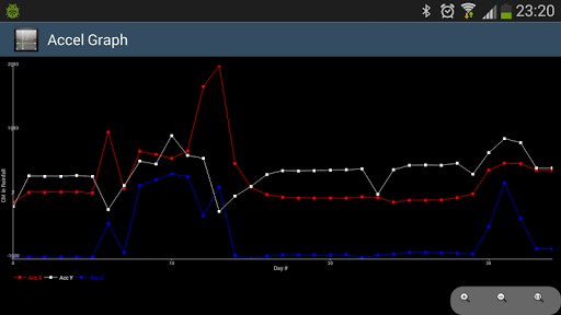Real time graph visualisation of data. Runs at a sampling rate 25hz. The values displayed represent the mean value of each axis (X, Y, Z)r eceived per second.