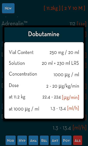 When you tap on the blue drug name, a window opens with vial contents, neccessary solutions, resulting concentrations, weight and age - based dosing information and finally the dose in [mg] und [ml] for the patient data you entered on the start screen.