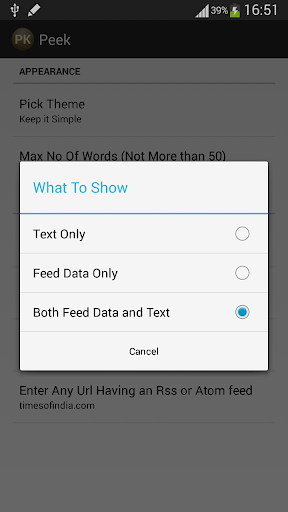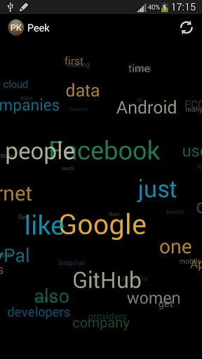 Peek can be used as a live wallpaper or as any other app. It shows words in an interactive tag cloud structure. Tag Cloud is a structure used to represent most frequently occurring words from any bunch of text.