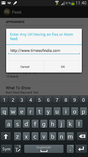 Go to settings and add any url providing rss or atom feed. If the feed is supported you’ll get the latest trending words on your tag cloud. You can keep update frequency to what suits you. For e.g. put in update frequency to “Daily” and url to “http://www.espncricinfo.com” and get daily updated trending words in cricket world.