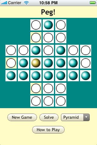 Peg! is a one-player strategy game whereby you try to eliminate all the pegs on the game board by jumping other pegs in strategic ways.
