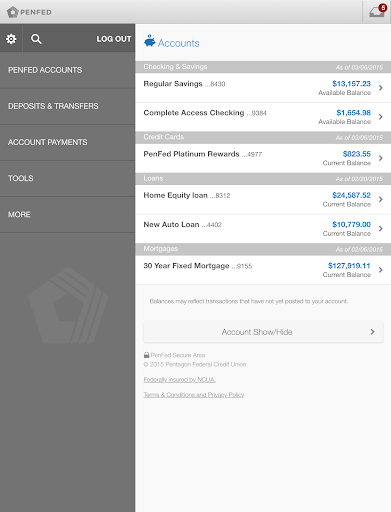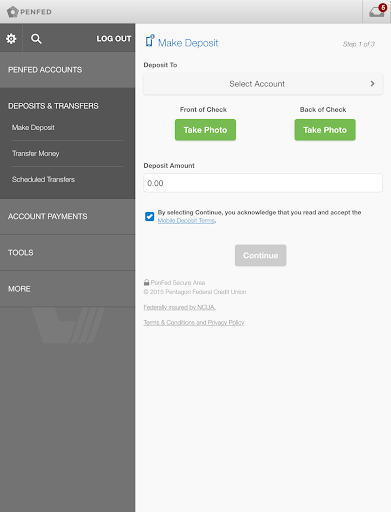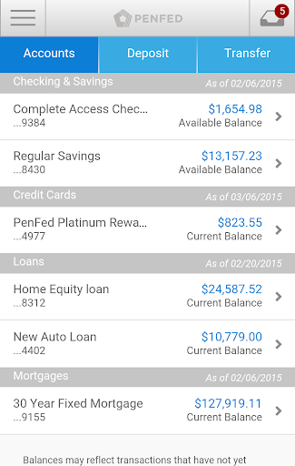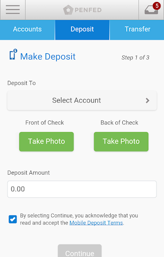 The PenFed Mobile banking app provides around-the-clock access to your PenFed accounts. Get transaction details, transfer balances, track loan application status, and much more! Deposit checks quickly and easily with your smartphone.