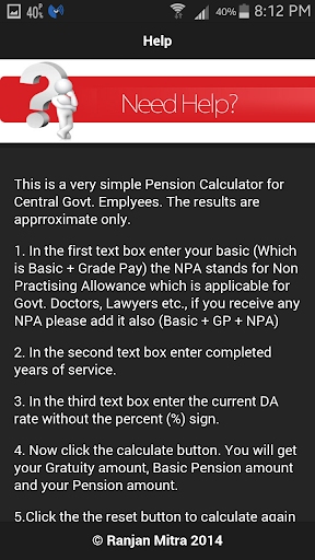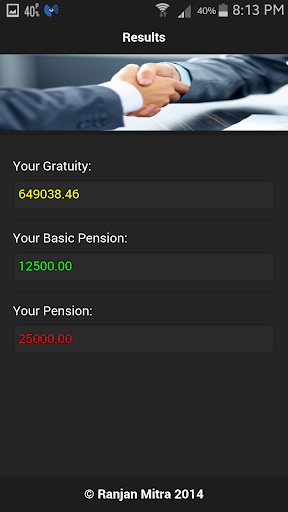 This Pension Calculator has been made keeping in mind Central Govt. employees of India. If you are on the verge of retirement or just curious to know in advance what might be your pension when you retire, this application may help you to calculate that. It show how much gratuity you might expect, what will be your basic pension and your total pension amount.
