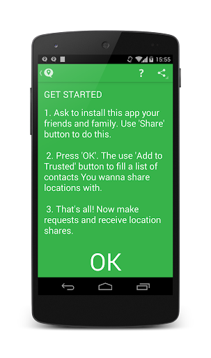 1. Install app on all devices you want to share locations with. Share link to this page or use in-app "Share" options to install this app to your friends and family.