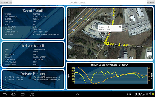 Receives real-time alerts of critical fleet incidents with the PeopleNet EventAlerter(TM). Designed for users of the PeopleNet Fleet Management system, the PeopleNet EventAlerter sends relevant safety alerts to fleet managers in instances of critical incidents (rollover-stability, sudden deceleration, etc.). A satellite map of the incident is provided along with pre and post-incident trails, all of the particulars of the incident, the identity of the driver, the driver's available hours of service (HOS), and the past 24 HOS activity. The last five safety events for the driver are also displayed to help access the emergence of a negative trend.