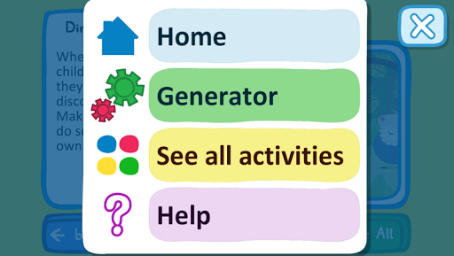 As a parent you can choose to See All for a comprehensive list of activities - just select one then follow the step by step instructions. If your child wants to get involved you can search for a random activity by using the Generator, where they can press a variety of buttons to get some silly surprises.