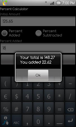 This simple app will answer all those questsions for you, and more! It gives you the option to enter an inital ammount and the percentage applied to it. It then lets you chose whether you want to subtract that amount or add that amount. The result is your new total and the amount added or removed.