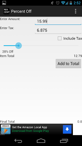 This app will calculate the value of an item after taking a percent off. For example if you were looking to buy a shirt that was 15.99 and 20% off, this app will calculate it.