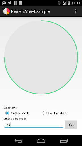 It allows the user to select a normal pie mode, or an outline mode - which only marks the percentage around the edge. I have included my edits to Sherif's code for that fix the issue of the background not showing. It will show the percentage in 3 different colours based on the percentage. These can be over ridden by using the setHighColour, setMedColour, and setLowColour. You can change the background with setBackgroundColour.
