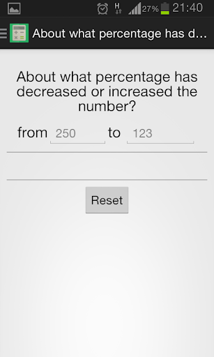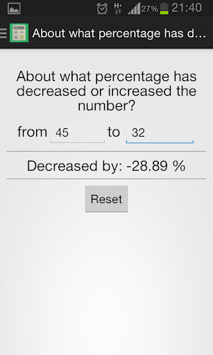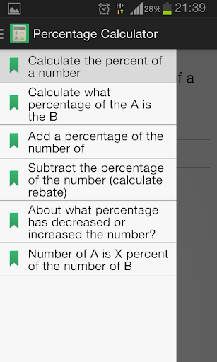 Percentage Calculator application allows you to quickly calculate percentages. Using the menu, you can use the following functions: