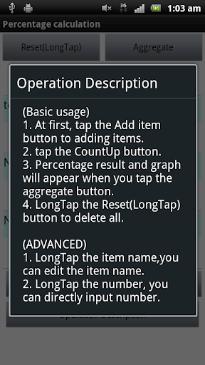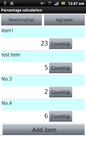 The operation is very simple, you can add as many items as you want, and continue to count in the "CountUp" button to display on a separate pie chart and percentage by pressing the end "aggregate" button.