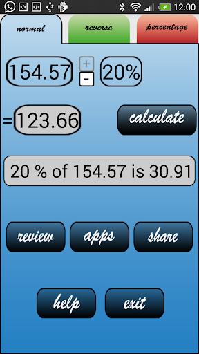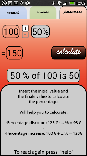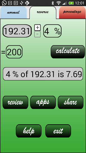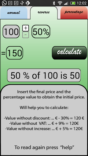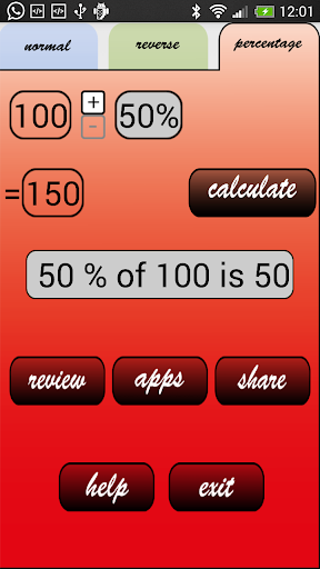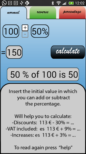 With these three functions: "normal", "reverse" and "percentage" Percentage VAT TAX Calculator will help you to resolve the operation of calculation as below: