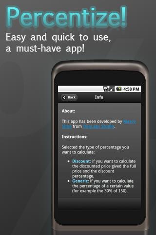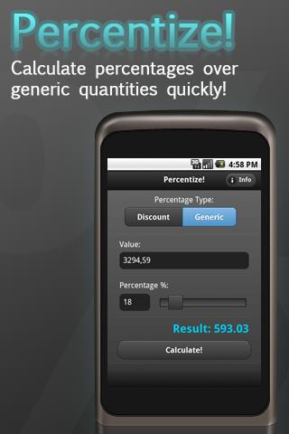 * Calculate Discounted Prices: how many times do you saw "30% off", "20% off" and so on when you are in shops ? Percentage let's you calculate the discounted price easily, just type the full price and the discount percentage, et voilà... percentize tells you the discounted price!