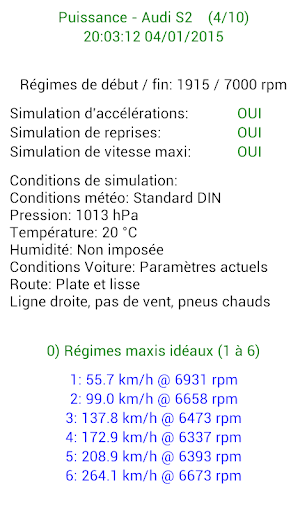 - Simulation ultra complète de performances, incluant le calcul des régimes maxis idéaux de poussée sur chaque rapport, ce qui la rendra indispensable à tous les pilotes de circuits et runners