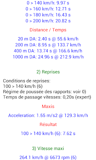 - Accélérations: 20m DA, 200m DA, 400m DA, 1000m DA, 0 - 20 km/h, 0 - 40 km/h, ..., 0 - 200 km/h, etc...