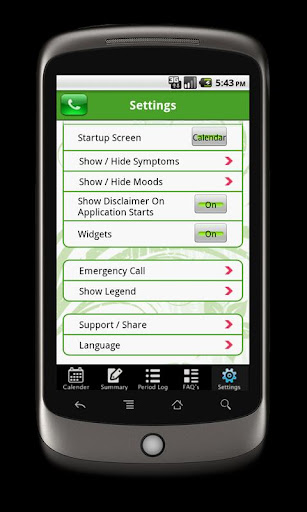 While settings allow user to set: fertility period, Startup Screen, Show/Hide Moods & Symptoms