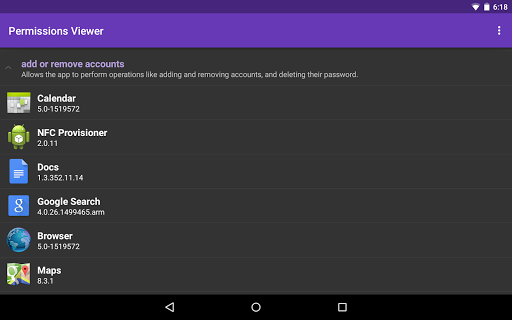 Permissions Viewer lets you view an alphabetical list of all Android permissions and lists which applications take advantage of which permissions. While most permissions are harmless, some applications request to use permissions that can create security vulnerabilities by releasing your sensitive data.