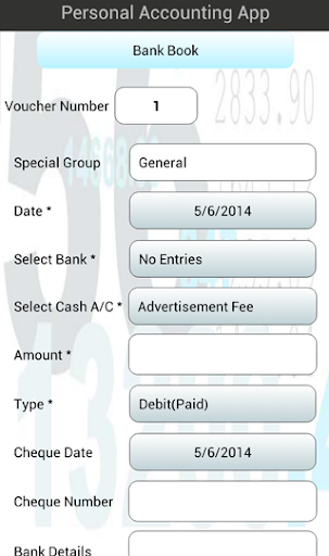 Your transactions which uses a bank account can be filled through this. If the amount is debited/credited via cheque then you can enter the cheque details also. If the type of payment is debit then bank details field is disabled as it will not be necessary else if the type of payment is credit then bank details field will be enabled.