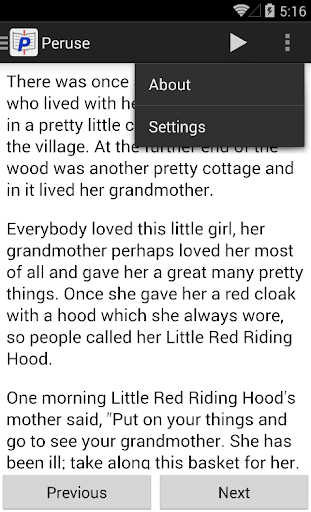 Note: e-pub spritzing is in an early experimental stage. To go back to the last page you were at, after spritzing the page, go to the navigation drawer (top left) and select "Peruse" again. This action will take you back to the last e-pub "page group" you were at in the e-pub before you pressed the play to spritz button.