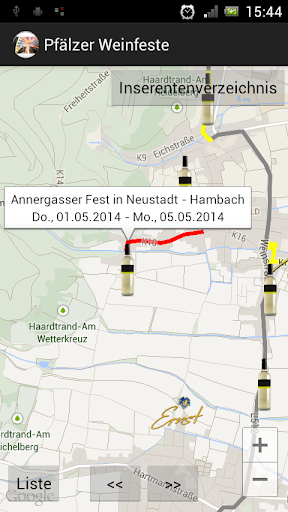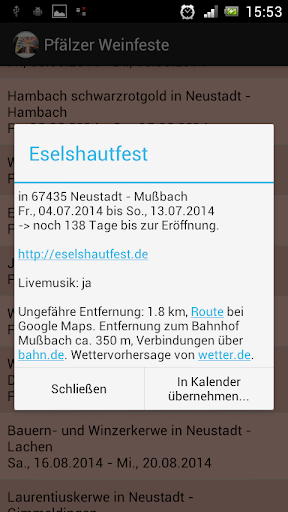 Ansonsten sind über die Zeit eine Bewertungsfunktion für die Feste (Internetzugang und Auslesen der Geräte-ID erforderlich; für die Experten, letztere verlässt das Gerät nur "gehasht", so dass sie nicht zurückverfolgt werden kann) sowie Links zu wetter.de und dem Google-Maps-Routenplaner dazu gekommen.