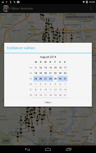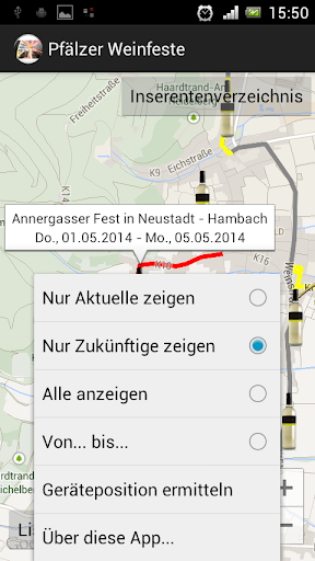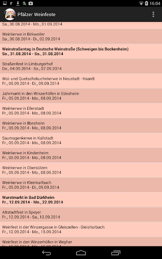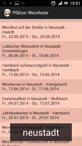Der mobile Weinfestkalender für die Pfalz zeigt die Pfälzer Weinfeste des Jahres 2014 in einer interaktiven Karte mit verschiedenen Filter-Optionen an. Internet-Zugriff wird dafür momentan benötigt, es sei denn die Karte wurde vorab im WLAN (automatisch) gecacht. Eine Android-Version größergleich 3 wird empfohlen, da in älteren Versionen leider nicht alle Features funktionieren.