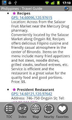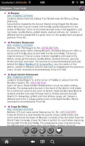✔ The top restaurants have been individually selected by MobileReference editors. These restaurants are marked by a star in the EAT chapter and are plotted on the GPS map.