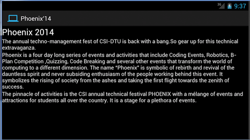 Phoenix 2014 is the annual techno-management fest organized by Computer Society of India DTU Chapter (CSI- DTU). The fest is conducted in the second week of February every year. Ever since its inception, CSI- DTU has persistently channelized its entire endeavor so as to nurture excellence. And living up to the legacy, CSI- DTU is proud to proclaim: the Phoenix has risen again. And so have the dauntless spirit and the never-subsiding enthusiasm of the people working behind this event. This time with an intention to leave everyone spellbound. Come and experience the technical extravaganza at its best!