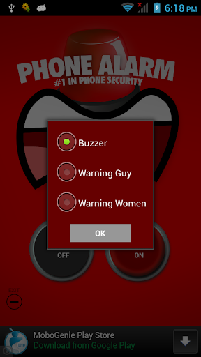 The Funniest Phone Alarm is Available Now For Android For Free! As Seen on popular vine and youtube videos "Wake Up This Bitch is On Your Phone", "New iphone 6 feature" and More! The originally created gag app has 3 sounds to choose from: Buzzer, Warning Guy, Warning Girl. Simply Turn on app and when you phone goes to sleep the Phone Alarm is Activated. Install Now and Share with Friends!
