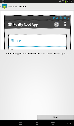 From any application which shares text, choose “share” option. A list of applications which can receive text will be shown, choose PhoneToDesktop. You will see a notification while PhoneToDesktop sends the text. When the text is sucessfully sent, the notification goes away.